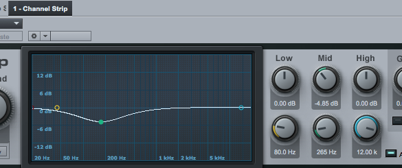 6. You’ll now have a rough balance but things won’t quite be sitting nicely.  Now put a ‘channel strip’ (or EQ if using another DAW) plugin on each track.  You now need to cut and boost various frequency bands to take away the parts of the instrument sounds that are not important (such as mid range on a kick drum).  Try stick to just cutting frequencies, don’t boost (as sometimes making something louder makes you think it’s better when it’s really not).  By cutting ‘unnecessary’ sounds from some instruments you create space for other instruments to ‘breathe’.  A good example is to cut mid-low frequencies from the kick drum to stop it from ‘competing’ with the bass guitar for the low end.